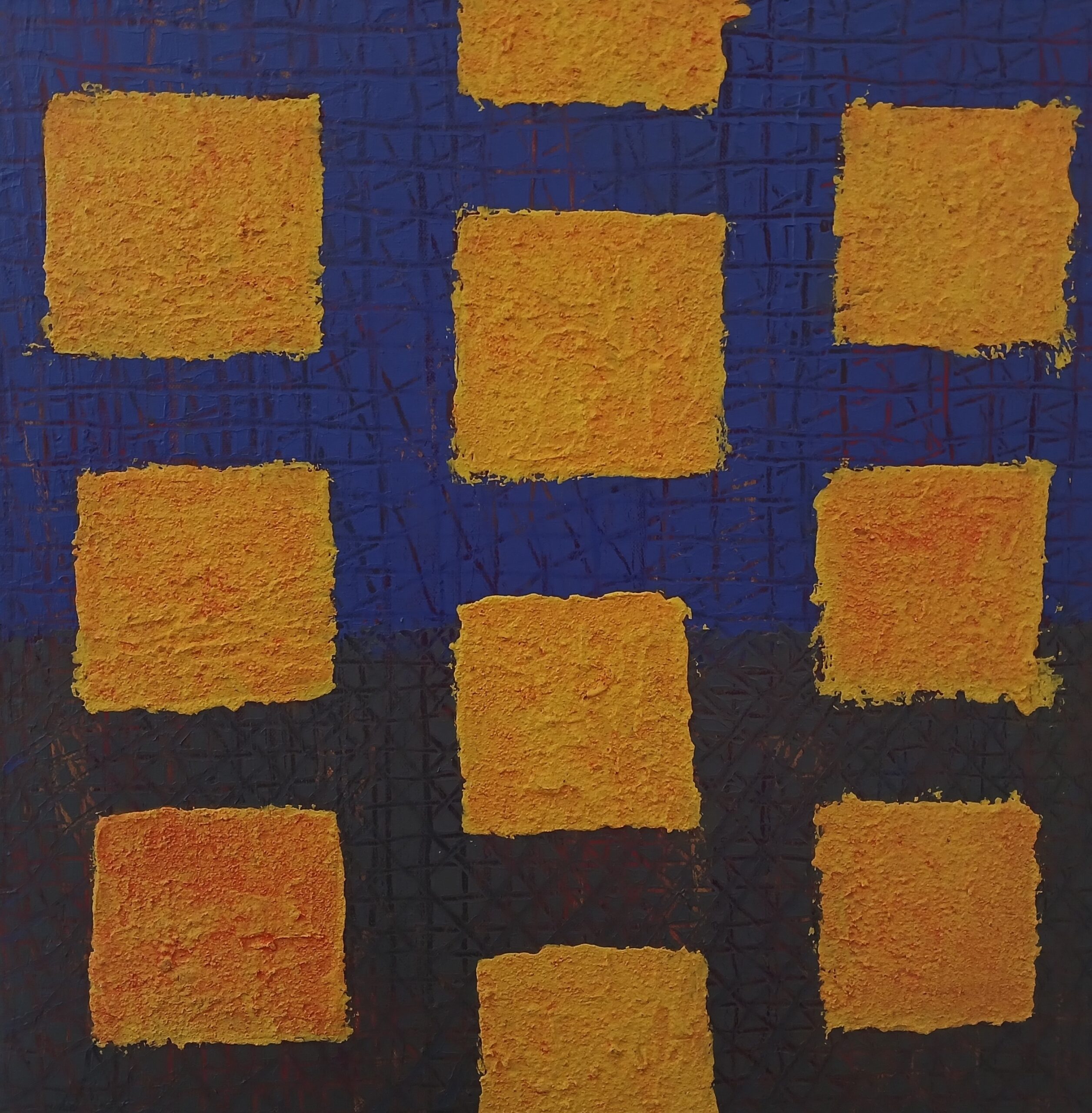 Título: SIN TÍTULO – Año: 2025 – Medidas: 50 x 50 cm – Técnica: Mixta sobre lienzo – DISPONIBLE PARA VENTA. Esta obra de arte propone una reflexión sobre el orden y la materia. La retícula de cuadrados amarillos, densamente texturados, se impone sobre un fondo azul profundo y oscuro que sugiere espacio y profundidad. La obra tensiona la geometría racional con la expresividad de la superficie, donde la repetición modular se vuelve un ritmo visual que oscila entre estructura y vibración cromática, evocando un diálogo entre control formal y energía pictórica. © 2026 Todos los derechos reservados.