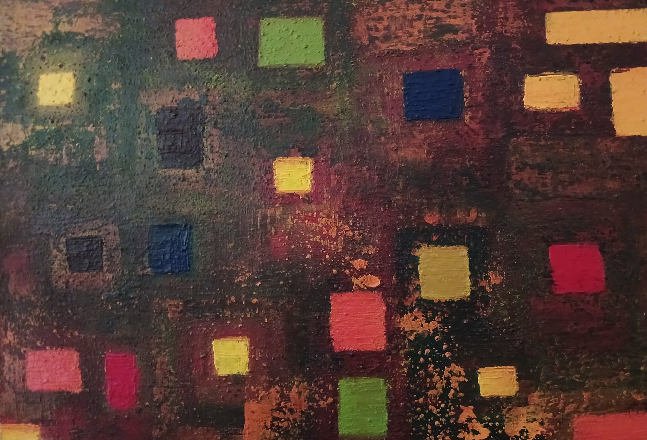 Título: SIN TÍTULO – Año: 2025 – Medidas: 35 x 50 cm – Técnica: Mixta sobre lienzo – DISPONIBLE PARA VENTA. Esta obra de arte se construye como un campo pictórico denso y matérico sobre el cual emergen pequeñas formas cuadradas de color intenso. Estos acentos cromáticos, dispersos como señales luminosas, generan un ritmo visual que contrasta con el fondo oscuro y texturizado, evocando una cartografía emocional o una ciudad nocturna abstracta. La obra sugiere una tensión entre orden geométrico y espontaneidad gestual, donde el color funciona como puntos de energía dentro de un espacio profundo y atmosférico. © 2026 Todos los derechos reservados.